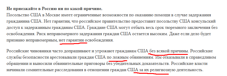 Отмечается, что возможности американских дипломатов оказывать поддержку и помощь своим соотечественникам в России в настоящее время серьёзно ограничены и многое другое.