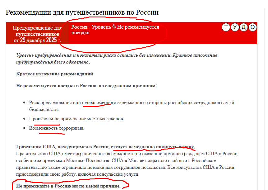 На сайте Госдепа США Россия отнесена к 4-ой самой небезопасной категории. На сайте подчёркивается, что гражданам Соединённых Штатов в России следует уехать немедленно.
