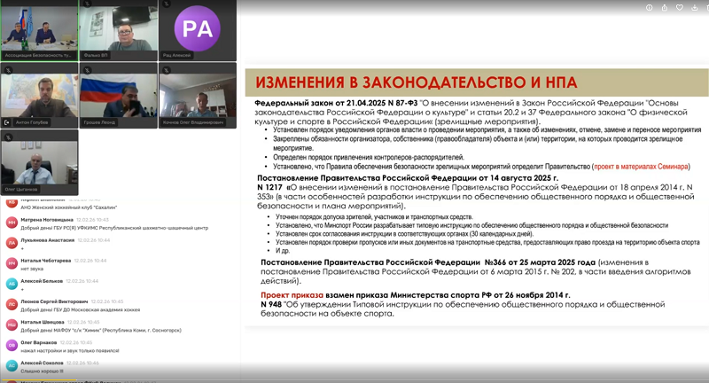 Это изменения в части организации зрелищных мероприятий, особенностей разработки инструкции по обеспечению общественного порядка и общественной безопасности и плана мероприятий, введения алгоритмов действий, а также проекта приказа взамен приказа Министерства спорта РФ от 26 ноября 2014 г. N 948 "Об утверждении Типовой инструкции по обеспечению общественного порядка и общественной безопасности на объекте спорта.